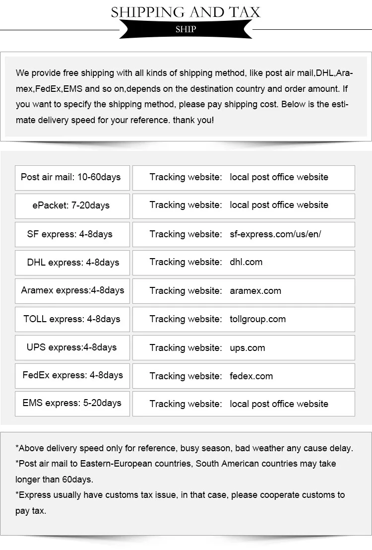 Packages from our warehouse in China will be shipped by ePacket or EMS depending on the weight and size of the product. Packages shipped from our US warehouse are shipped through USPS.